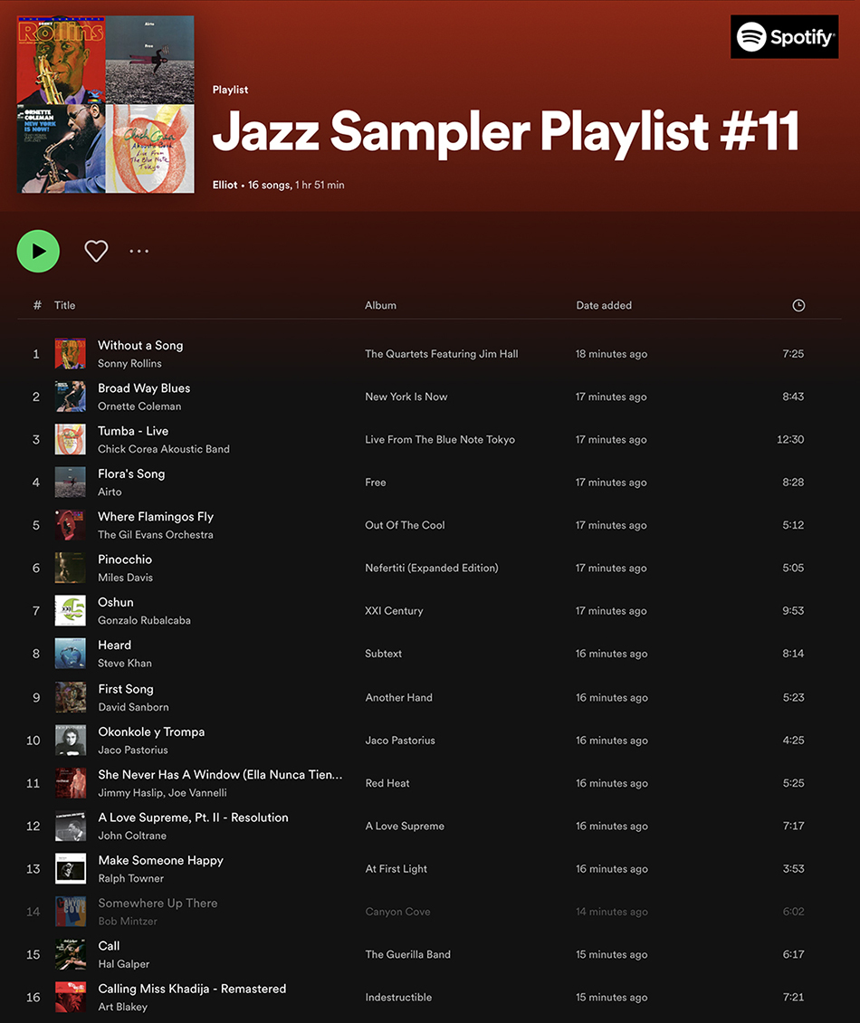 The contemporary world of music listening seems to have passed me by. I still don't get it.So, I decided that, with the help of my close friend, pianist Antonio Mazzei, who now lives in Barcelona, Spain - after having spent many years here in New York - and who IS well-versed in Spotify - we would assemble these Jazz Sampler Playlists, and he would create them for me @ Spotify. I began with just 2 of them. Those first two playlists covered a total of 26 tunes, 13 on each one. Generally speaking, I tried to select music/performances that, for me, represented in some way, shape or form what "Jazz" sounds like to me. Of course, this is all very subjective. My friend in India knew nothing about my own recordings, so I tried to slip one song in here and there. Another person, another musician might have selected a completely different list of tunes and artists. What was I trying to accomplish? Well, I wanted to best represent, if possible, ALL of the various sounds, colors, flavors, textures, moods, attitudes, and vibrations (I'm sounding like an old hippie now) of the music that I have loved so much since I was a teenager. As time passed, and Antonio and I had created 15 playlists - some of them came to a total of as much as 2 hours of music. In all, some 254 songs were present - to be accessed and enjoyed. As I watched the total music time grow from playlist to playlist - I began to confront the fact that most people, these days, can barely get through listening to one single piece of music without being interrupted by their damn smartphones, or some other contemporary distraction! [Welcome to Short Attention Span Theater] So, why bother to put so much love and effort into these playlists? I suppose that the best answer that I can come-up with is that, IF the Samplers reached just ONE person who enjoyed, and saw the beauty in them - then it would have been worth it all. That said, I don't expect anyone to listen to any one of these playlists and actually get through them from start to finish! No way!!! If you click on the image just above, it will take you to what I would call a COMPOSITE page @ Spotify where you can access any one of the 15 Jazz Sampler Playlists all on one page! Or, you can scroll down here, click on any one of them and access that playlist! It's up to you! After much thought, my plan became to present TWO PLAYLISTS PER WEEK @ Facebook, on Tuesdays and Fridays, and then to see what happened, if anything. My criteria for most of the selections, no matter how physical or intense the music might be, was that THE MUSIC WOULD BE LISTENABLE - and, at any volume. I tend to listen to music, most of the time, at a level where I can FEEL IT in a PHYSICAL manner. MUSIC IS PHYSICAL to me, and SPIRITUAL in that way - but, it is NOT like that for everyone. So, I felt that IF a person who had any of these playlists could, for example, put on one of them via their streaming device, and just do other things, like working at your computer or iPad - be it, having a gathering for dinner, and using it as some kind of sophisticated "background music" for the evening - Or, they could just be cleaning their home, and the playlist would be on. And, of course, they could be at the gym on the treadmill or some other machine, and just drift away into THIS world of music. Who knows? I would be willing to bet that if multiple people were listening to one of these music collections/samplers together - even if it was only in the background, someone would eventually say, "Hey, what's that tune? Who's the artist?" And therein lies the "magical moment" when someone might make the effort to then, go out and find that artist, that song, that album and then, add to their own collection of music. That would be a great victory right there. So, that was my general hope. For most people, listening to instrumental music, non-singing music, music without lyrics is really, really difficult. By and large, people need the "message" in or from the music to be spelled-out for them - beyond a song title, and within the lyrics or the "story" of the song. So, "Jazz" - which is, for the most part, instrumental music - becomes a more challenging listening experience. Does one have to "understand" something about music to enjoy and/or appreciate it? I don't think so! I believe that you just have to let your mind or spirit drift somewhere with the music and the feeling(s) or memories that you attach to it, those things become what the piece is about. In a sense, it is kind of simple - but some degree of an imagination is important. Just a thought. Now, why don't I belong to Spotify? Well, for me and most artists, musicians, composers, publishers, and yes, record companies too - not one of us feels that we are being properly compensated for the usage and performances of our music and/or recordings as people happily, without a care in the world, stream away for some kind of a monthly fee - and we, as artists, are getting paid in, as we like to sarcastically call it, DIGITAL PENNIES. But it is NOT a joke! So, what do we do? On the plus side, that people have access to our music, and they can choose to hear it - that is a gift. At least, perhaps, it is not as bad as file sharing - where NOTHING goes to the artists, etc. It would seem that we all have to accept a part of this and hope that we're reaching someone out there - every so often. But still, there is something not quite right about this system. I repeat, what do we do? What can we do? I have no answers for that - it is far too complex for a humble artist, a small artist, like me to come-up with a global solution that would benefit everyone, and be acceptable to all. I guess this will all be solved eventually, but long after I have passed into another realm/plane of alternate realities. If such a thing exists. Once again, an old hippie talking! For those of you who are trying to find a pathway into this genre of music that many of us have dedicated our lives to - maybe thes