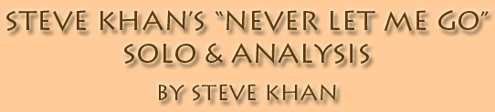 Steve Khan's solo on: "Never Let Me Go"(Ray Evans-Jay Livingston) When the decision was made that I would record again, if I knew anything, it was that I wanted to continue exploring Latin music, and Latin rhythms as I had done on "PARTING SHOT" in 2010. No matter what the genre of music might be, any recording needs at least one ballad, and where Latin rhythms are concerned, that means that there is going to be a bolero. No matter what the style or instrumentation of any of my recordings has been, I love interpreting and playing ballads. In truth, I probably would have preferred to have composed something original, but the muse for such things just didn't seem to appear for me. Even prior to the last recording, I was listening to the great Shirley Horn's version of "Never Let Me Go" and found it to be especially touching and moving. Her affection for, and complete understanding of the lyrics gave me a particular connection to the song, and that feeling never left me. So, as "SUBTEXT" was coming together, in terms of song selection, a place for this wonderful ballad was assured. When a song, especially a love song, becomes a standard, it is interpreted by the great singers, and many of the great Jazz artists, one can usually assume that the song was written for a film. Often times, that film was made during the '40s or the '50s, and even into the early '60s. I couldn't recall if "Never Let Me Go" had appeared in a film, but I certainly did not remember that it had won an Oscar®! A little research, and it turns out that the great Nat "King" Cole actually sang the song in the 1956 film, "THE SCARLET HOUR." I was shocked to learn that the wonderful songwriting duo of Ray Evans and Jay Livingston, whom I had met many times as a youngster in Los Angeles, did not even receive a nomination from the Academy for this song. Sometimes, the greatest songs appear in what used to be known as Hollywood 'B' movies. In other words, lousy films that often become known, because of the love theme song contained within. In 1956, Evans and Livingston won the Oscar® for "Whatever Will Be, Will Be" (Qué Será, Será)," a positively dreadful song. In 1957, the duo was nominated again for another awful song, but like the former winner, the extremely popular, "Tammy." My best guess is that "Never Let Me Go" should have received a nomination in 1957, but it didn't. In hindsight, it's a shame, but, when one considers the depth of this saddest of sad love songs, Evans and Livingston are the huge winners, no matter what!Apparently, the sheet music key for "Never Let Me Go" is either G minor, or Bb major, so I'm not really certain at just how I arrived at playing the song a whole-step lower in F minor, or Ab major, but there is a particular warmth that this key provides, and it allows the guitar to sit in a very comfortable register. It becomes obvious that the harmonic influence of Clare Fischer is heard and felt throughout the recording, but certainly no more so than via the sonorities that accompany the melody to this ballad. The widely voiced chord colors that make-up the Introduction or [I] set-up a mood that we all settled into right away. The traditional bolero rhythms, as performed by both Bobby Allende(conga) and Marc Quiñones(timbal), offer a steady underpinning. For something like this, for the element of elasticity, I like to have Dennis Chambers playing brushes, and adding Jazzy textures, plus, at times, a swingy feel against the very up-and-down nature of the Latin rhythms. When you add in the beautiful colors of two flat ride cymbals with rivets, the piece can begin to float without much else. Rubén Rodríguez' outstanding Baby Bass playing adds great depth and creativity in the lower register, his playing enabled me to play in a way that, everyone who has heard this performance seems to respond to. The other important colors were both added on as anticipated overdubs by Marc. Those being the wonderful sounds of his small maracas, and finally his creative and responsive playing on the bongo, which is really the instrument that offers the most spontaneous commentary to what I had played.Though I hardly possess any kind of keyboard agility, I am able to get around the instrument, and slow-ly create harmonies that I respond to the most. Harmonies that offer the most gorgeous support to this melody. When one is creating this kind of harmonic cushion, which some have come to refer to as pads, I like to try to keep these sonorities tucked-in just beneath where the guitar sounds, wherever that is possible. To me, the arrangement that I wrote owes everything to trying to capture the sense of great romance that I hear when I hear Clare Fischer's sense of harmony. So, I labored greatly over the changes to this strange little [A]-[A2] form, where [A] is the expected length of 16 bars, but [A2] is only 12 bars. The song is not symmetrical in form as most of the songs of this era would be. However, the form is perfect for the expression of the story contained within the lyrics. It's hard to imagine a much more perfect song. When I turned over my demo with my arrangement to the brilliant and immensely talented Rob Mounsey, I was expecting that he would change any number of the voicings that I had written. But, to my great surprise, and feelings of satisfaction, he told me later: "No, everything that you wrote was great, I just assigned better sounds to what you had written. That's it!!!" I think that this was one of my most proud moments during this long and arduous creative process of making the album. What Rob did do was to add in these subtle but lovely touches underneath the solo when [A] returns. Though I did not transcribe what I played during the Outro of this piece, which comprises letters [C]-[D] and [E], like the Intro, Rob chose to orchestrate what I had written with woodwinds, and I recall him mentioning flutes. It's a sublime texture, and serves as the perfect contrast to what one hears as harmonic a